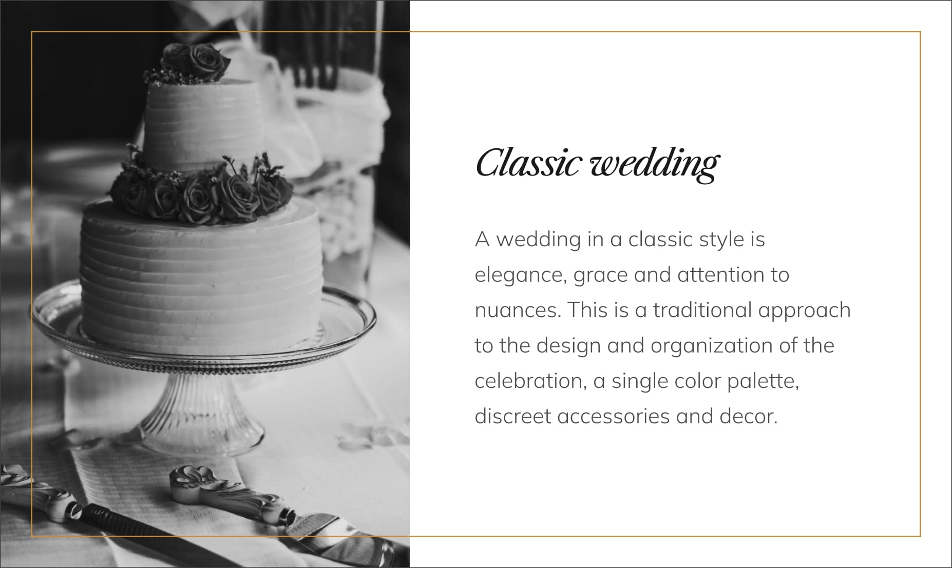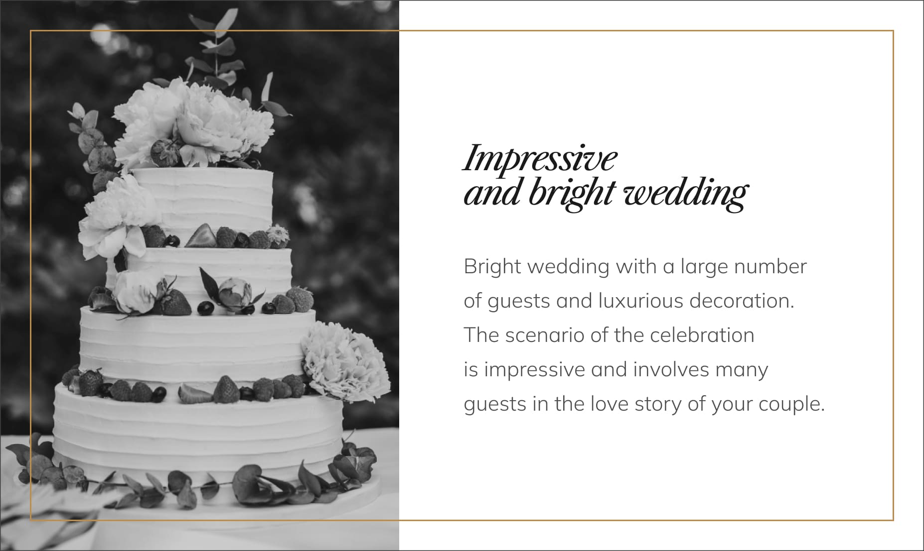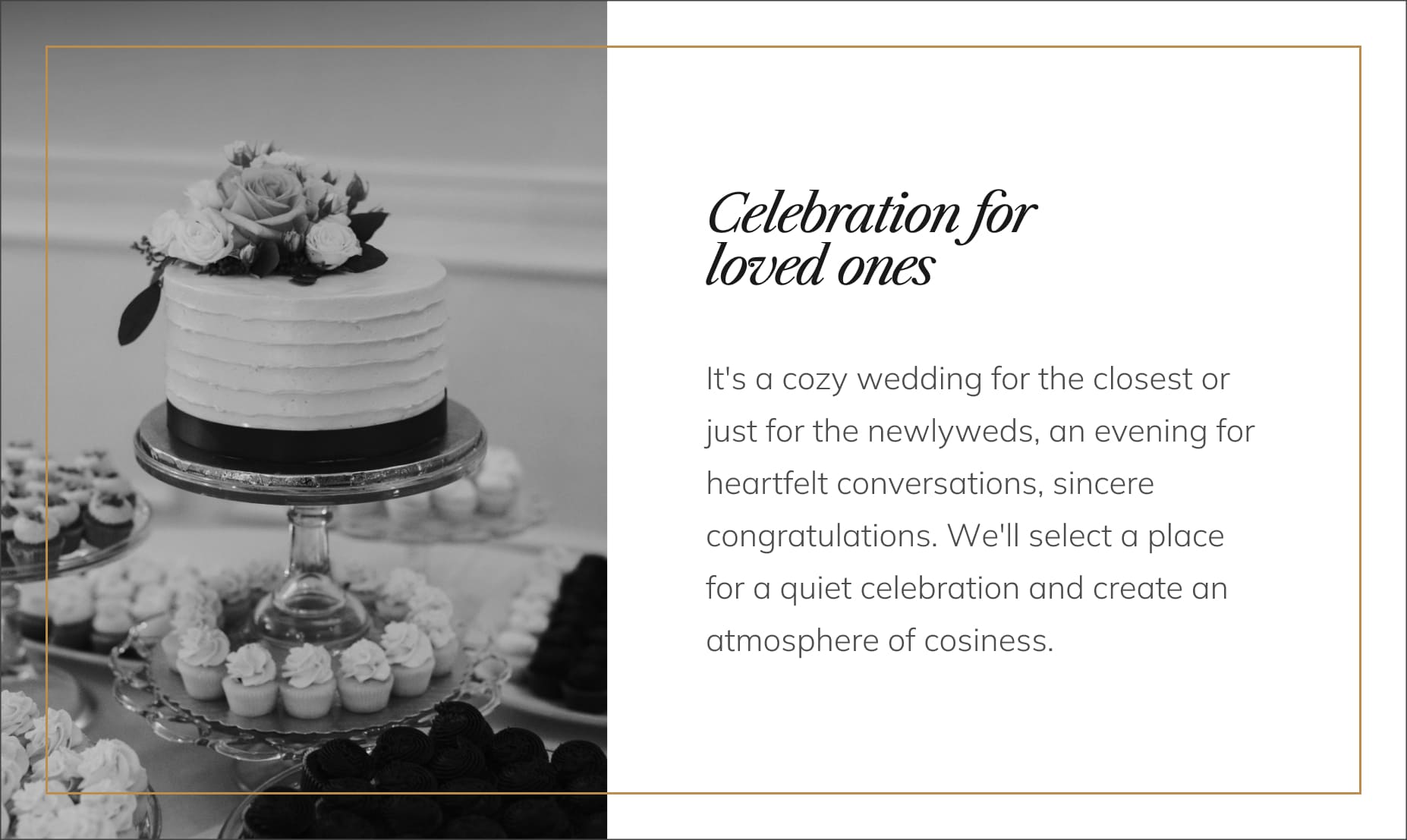 Every wedding is unique. Together we discuss its concept — from the first minute to the end of the evening. If you have your own idea, then we build on it. If not, we will offer a special concept for your wedding